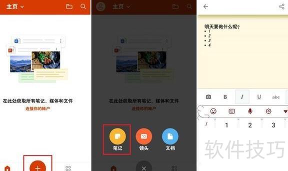 Office的主界面同样采用简约设计,整体风格与前者相近,包含主页、+号及功能操作区。点击+号,可看到笔记、镜头、文档等实用功能,布局清晰,便于用户快速访问常用工具。