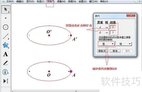 3、 构造第二个椭圆。先选取O点与A点,从变换菜单里点击迭代,于迭代窗口把A’点和O’点设为初象。在显示迭代次数按钮处选择减少次数,最后单击迭代,这样就能得到另一个椭圆。