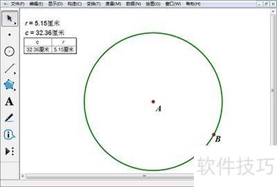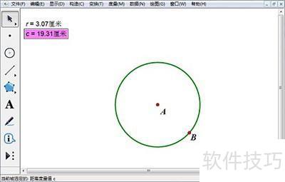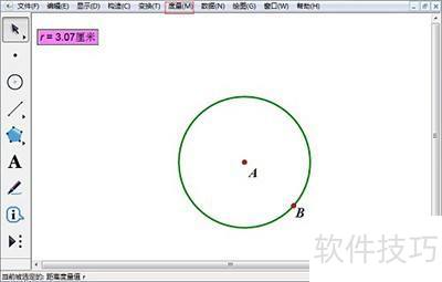 1、 绘制一个圆心为A的圆并测量其半径。在绘图区画圆后,仅选中A点和B点,接着选度量里的距离,右键度量值再选属性中的标签,将其修改为r。