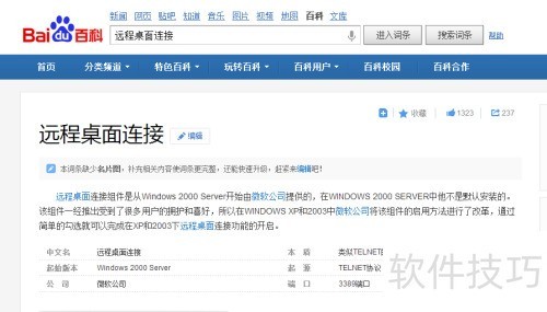 1、 先打开网络百科,搜索远程桌面连接,可看到其由来与部分基本功能。