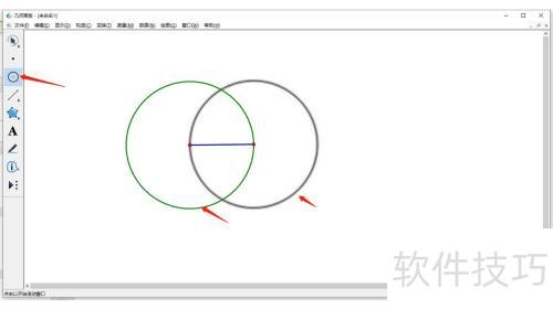 3、 从工具栏选择工具,以线段为半径,两端点为圆心,绘制两个等圆。