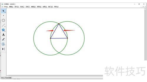 6、 从工具栏选择工具,选中两个等圆,按下键隐藏圆,即可得到等边三角形。