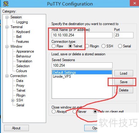 4、 输入信息后,要选择telnet类型并保存。