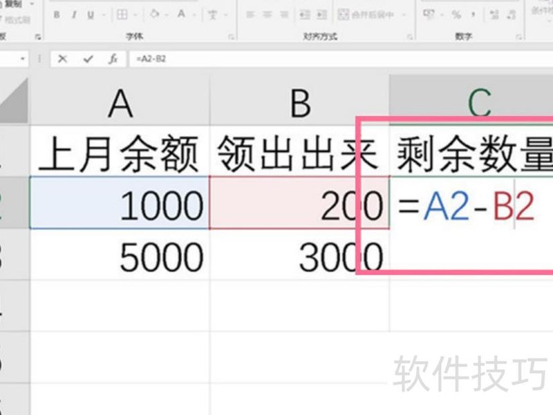 在单元格中输入公式=A2-B2,按回车键即可得出差值。