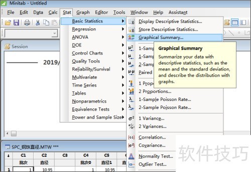 5、 从菜单栏依次选择:统计 > 基本统计 > 图形化汇总。