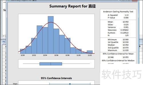 8、 生成的图形化汇总图将显示该列数据的正态性检验结果,包括A平方、P值、均值、标准差、方差、偏度、峰度、最小值、最大值和中位数等统计信息。