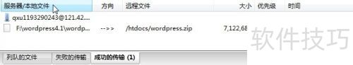 2、 开启FTP软件,将第一步制作的WordPress安装包上传至虚拟主机根目录。推荐上传压缩包是因为,直接上传19个安装文件可能因失败而缺文件,压缩包更稳定可靠。