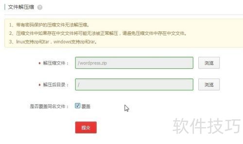 3、 使用虚拟主机自带的解压缩功能,将安装包解压到根目录。操作如下:解压缩文件选安装包,解压目录选站点根目录,同名文件选覆盖。完成后可删除安装包以释放空间。