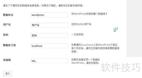 5、 看到以下界面时,按照提示输入相关信息。注意数据库主机一栏需填写数据库连接地址(以万网虚拟主机为例,可从空间站点信息中查找),表前缀选择默认即可。填写完成后点击提交。