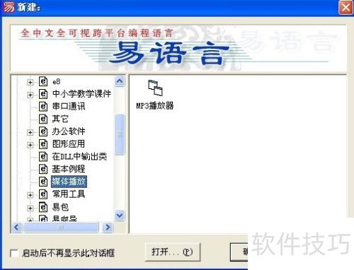 1、 打开易语言后,在新建窗口中找到易语言例程,再从其中的媒体播放里点击出mp3播放器。
