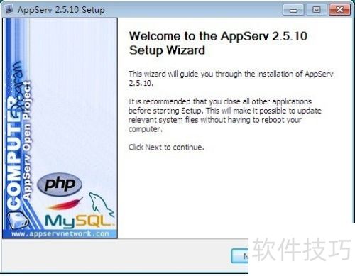 1、 双击AppServ安装包,打开AppServ启动页面(),点击next以进入下一步。