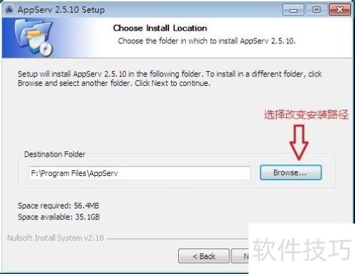 2、 在此页面能够对APPServ的安装路径进行设置(默认路径通常是C:/AppServ),安装完毕后,Apache、PHP、MySQL会以子目录的形式存于该目录下。点击next,即可进入下一步。