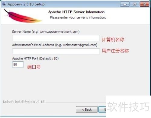 4、 这一步重点是设置Apache的端口号。服务器端口号的设置非常关键,这与Apache服务器能否成功启动直接相关。要是本机的80端口被IIS或者迅雷占用了,那还使用80端口就无法完成服务器配置。可以修改此处的端口(比如改成82),或者修改IIS或迅雷的端口来解决问题。点击next进入下一步。