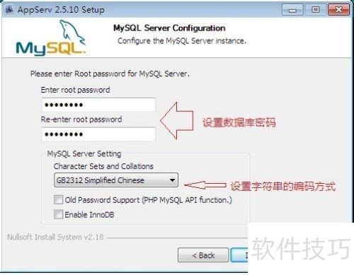 5、 这一步重点是设置MySQL数据库root用户的登录密码(设置的密码务必牢记,后续连接数据库时会用到),并且设置字符集。在此将字符集设定为GB2312简体中文,这意味着MySQL数据库的字符集将采用简体中文形式。点击Install按钮后就会开始安装。
