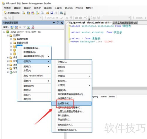 1、 在数据库ceshi上右键,选择任务中的生成脚本选项。
