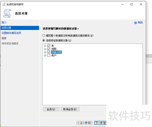 2、 在对象选择中选中特定数据库对象,再选择存储过程和视图。