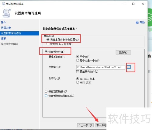 3、 选择将诸召孝脚本保存到特定位置这一输出类型,确定保存文件的存储位置后,点击下一步按钮。