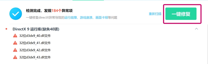 2、一键修复:点击directx修复,选择“一键修复”,等待几分钟完成修复。