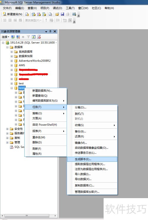 1、 打开sqlserver2008,连接成功后,选中存有需导出表的数据库,再点击任务--生成脚本。