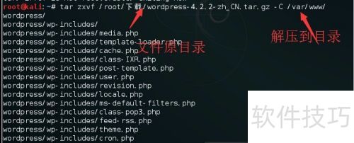 2、 将文件夹解压到/var/www/目录下:执行命令tar zxvf /root/下载/wordpress - 4.2.2 - zh_CN.tar.gz -C /var/www/。