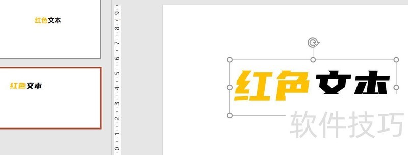两页幻灯片中同一文本框均含两种颜色文字,且每页文字字体各不相同。