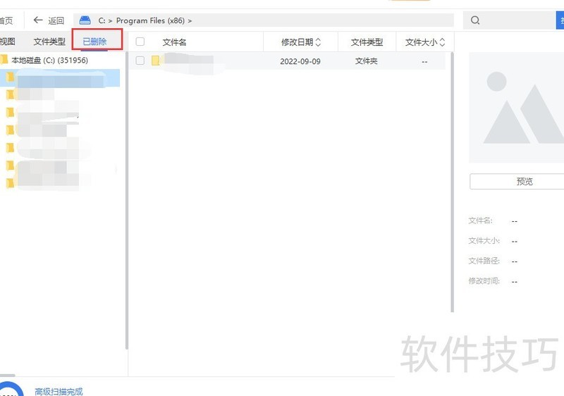 当内页左下角进度条显示100%后,点击左侧功能栏的已删除选项,在下方找到目标文件,点击恢复按钮即可完成恢复操作。