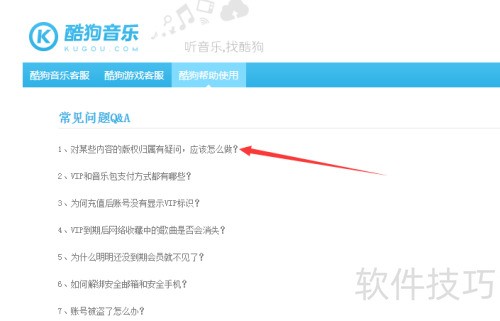 5、 点击使用帮助选项后,进入酷狗帮助界面,再点击常见问题中的任意一项。
