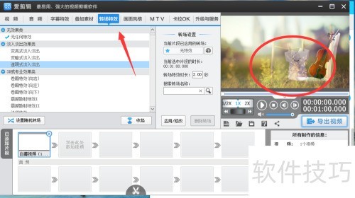 7、 重点说下转场,我觉得爱剪辑的转场都不太好看。点击转场,旁边可查看当前效果,能调整时长和方式。
