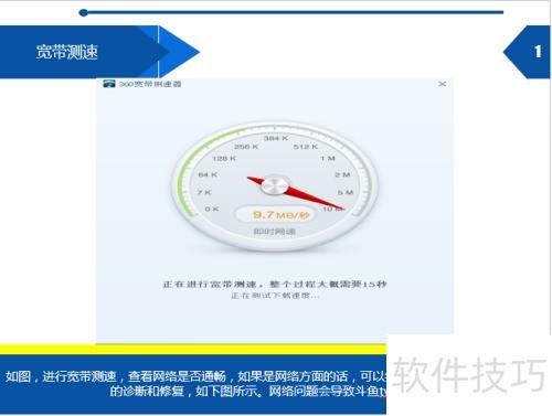 2、 所示,进行宽带测速,检查网络是否正常。若存在网络问题,可使用断网急救箱诊断修复。网络故障可能会导致斗鱼TV无法打开,请及时处理。