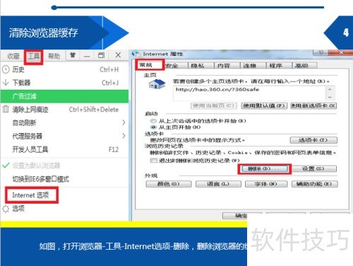 7、 请看图,打开浏览器,依次点击工具、Internet选项,选择删除,清除浏览器缓存,如下所示。
