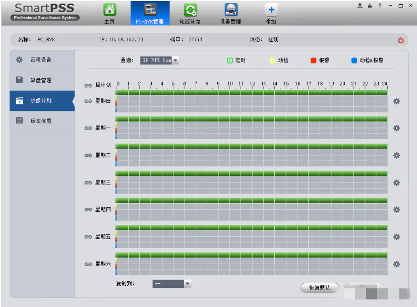 6、设置录像计划。默认是全通道的24小时普通录像,可以设置成其他录像,包括动检,报警等。