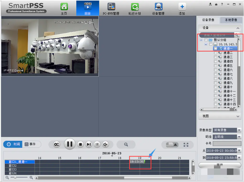 8、查询录像,点击主页中的回放,在右侧默认分组中选择添加的PC-NVR(显示的是电脑的IP地址),选择通道点击查询,在下面窗口中可以看到录像,点击播放。