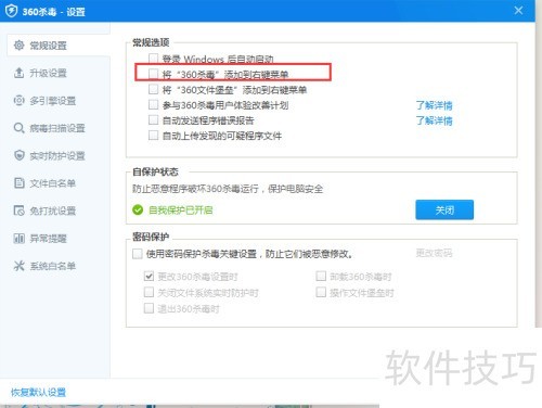 4、 在弹出的设置页面里,选择常规设置,右侧有将360杀毒添加到右键菜单选项,前面方框打勾。