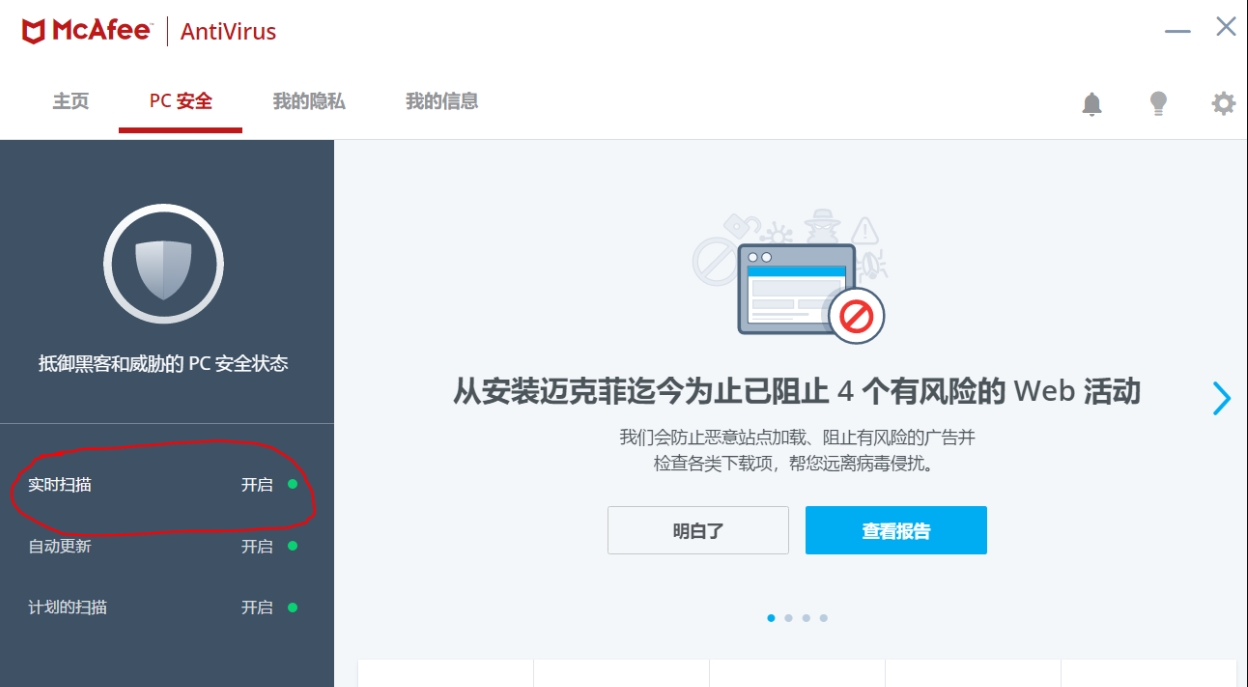 1、打开mcafee软件,点击“PC安全”,接着点击页面左侧的“实时扫描”。