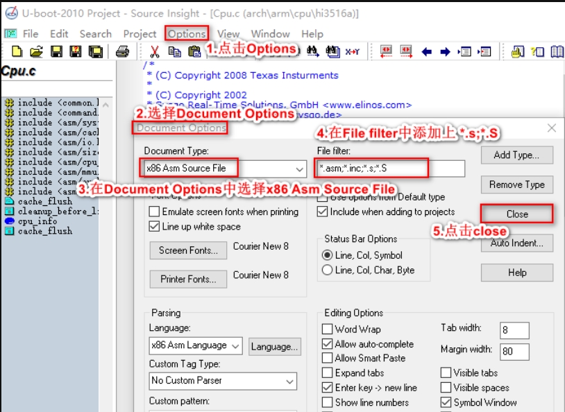 1、进入“Options → document Options”,在左上角将 document Type 切换为 x86 Asm Source File,并于右侧 File filter 的现有 .asm; *.inc 后追加 *.s; *.S,确认无误后点击 Close。