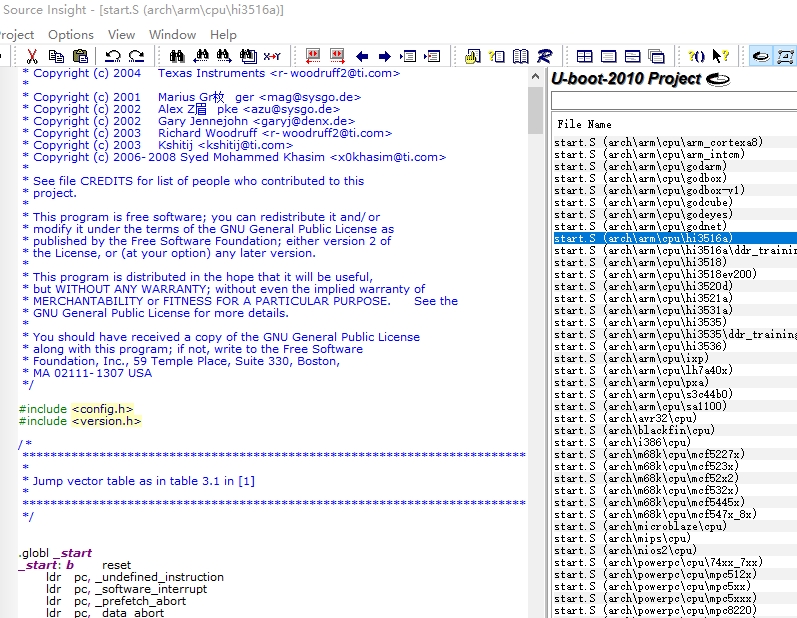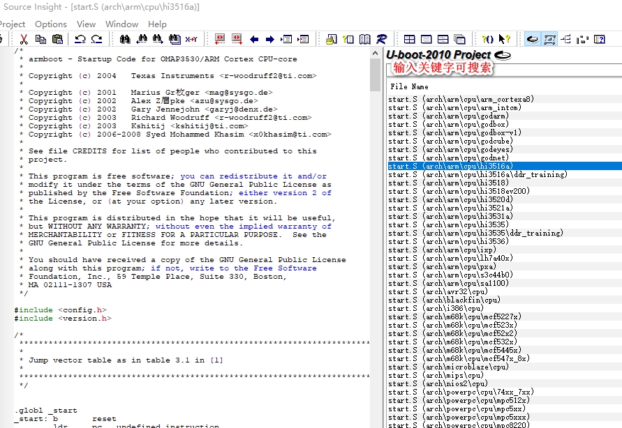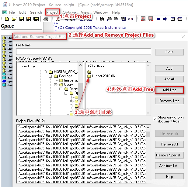 2、依次点击“Project → Add and Remove Project Files”,选中项目源码后执行 Add Tree,重新载入即可在工程中检索汇编文件;随后在右侧搜索框键入关键字即可过滤结果。此时尚未启用语法高亮,继续下一步。