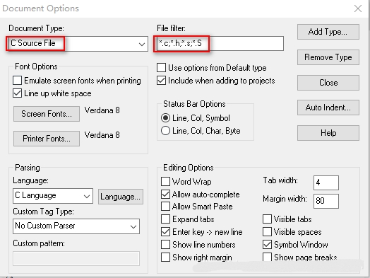 3、再次打开“Options → document Options”,将 document Type 设为 C Source File,然后在 File filter 末尾添加 *.s; *.S,点击 Close 保存。