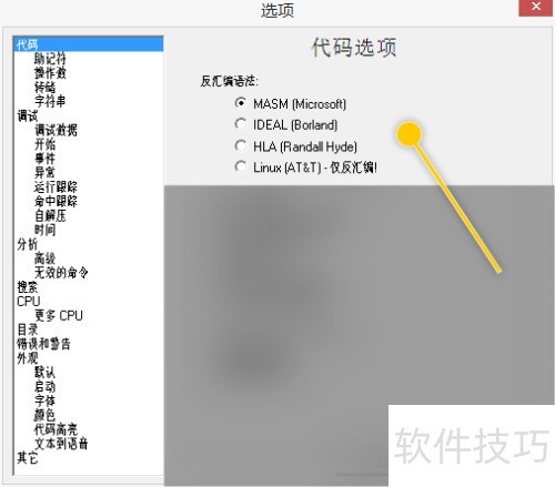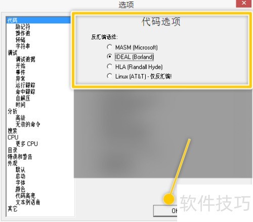 2、 在选项对话框中,单击反汇编语法区域。