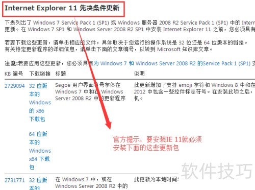 8、 官方提示IE 11需几个更新包,请根据系统是32位还是64位,下载对应更新包并安装。