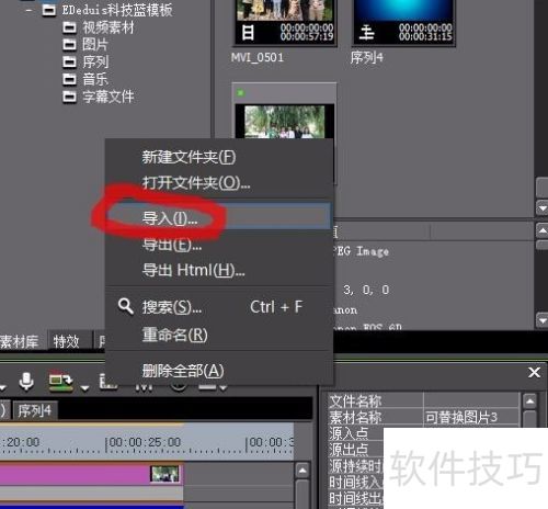 2、 在素材库中右键点击,选择导入功能,即可添加新素材至库内。