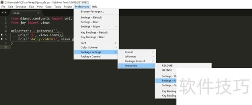 1、 在菜单里的Preferences(首选项)>> Package Settings(包设置)中,打开Anaconda的用户设置配置文件。