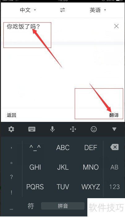 5、 接着,点空白处输入你吃饭了吗?,再点右下角翻译二字,所示。