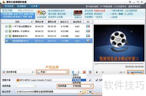 3、 所示,转换器具备一些辅助功能。比如,在文件列表下方可选择声道(适用于多声道音频),主界面右侧有视频预览与音频试听窗口,同时支持设置音频质量、输出目录(保存路径)等选项。
