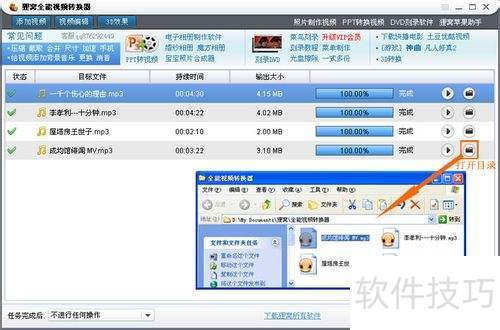 4、 完成相关设置后,点击转换器主界面右下角的圆形转换按钮,程序将自动开始转换。稍等片刻,转换完成后,所示。在对应视频文件行的右侧,点击小三角图标可播放音频,点击文件夹图标则能打开目录,查看已转换的MP3文件。