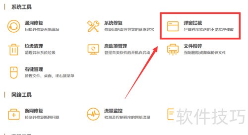 4、 然后,进入选项卡界面,于系统工具里找到弹窗拦截选项卡,点击它以安装弹窗拦截功能。