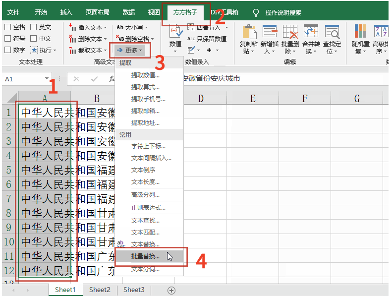 1、开启Excel办公软件,打开需要处理的表格数据,里面有三个表格。如图所示,1框选需要批量替换的数据——2点击方方格子——选择更多——批量替换。