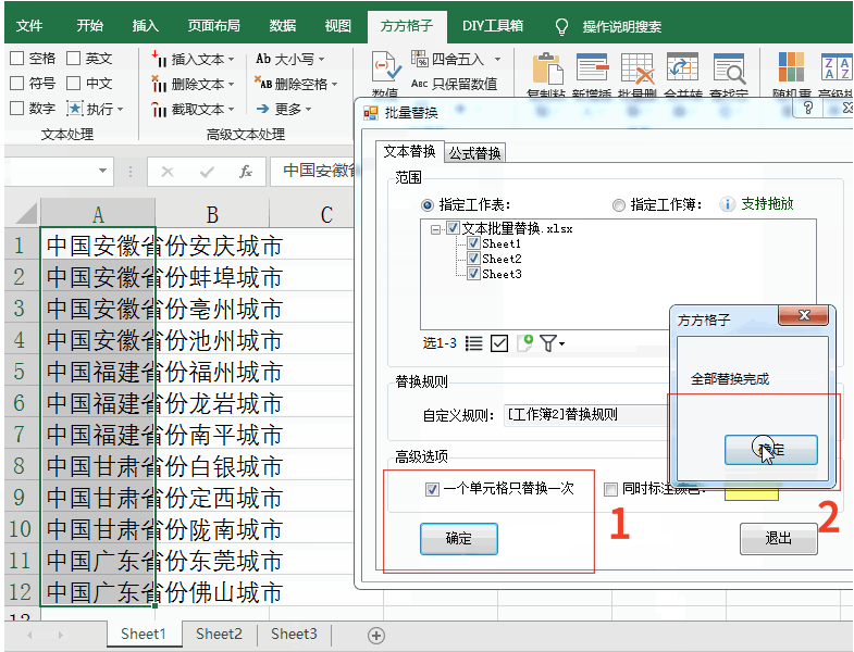 6、点击“方方格子”,点击1“确定”,点击2“确定”。三个表格连续点三次,替换完成即可。