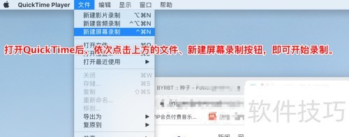 2、 打开QuickTime,依次点击文件和新建屏幕录制,即可开始创建录制任务。
