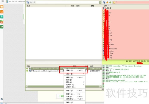 6、 在FlashFXP上传列表中,右键点击文件,选择传输选项,或者按下Ctrl+Z快捷键进行上传操作。