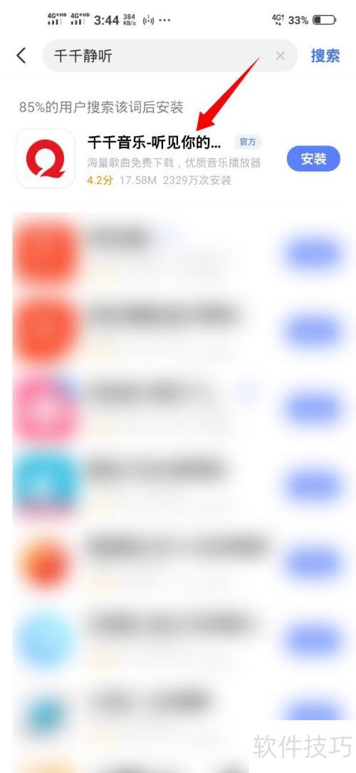 6、 点击搜索结果中排名第一的千千音乐。